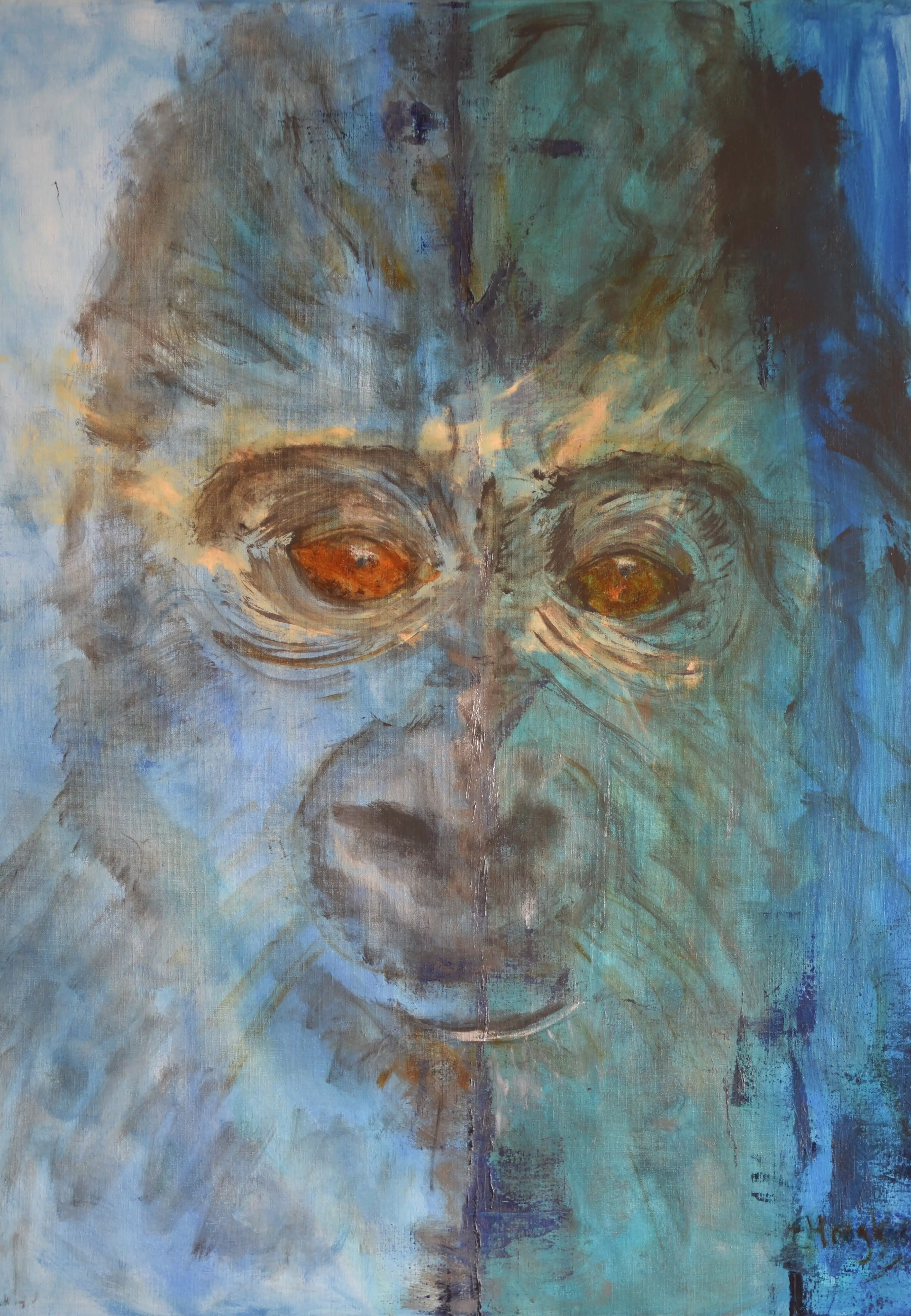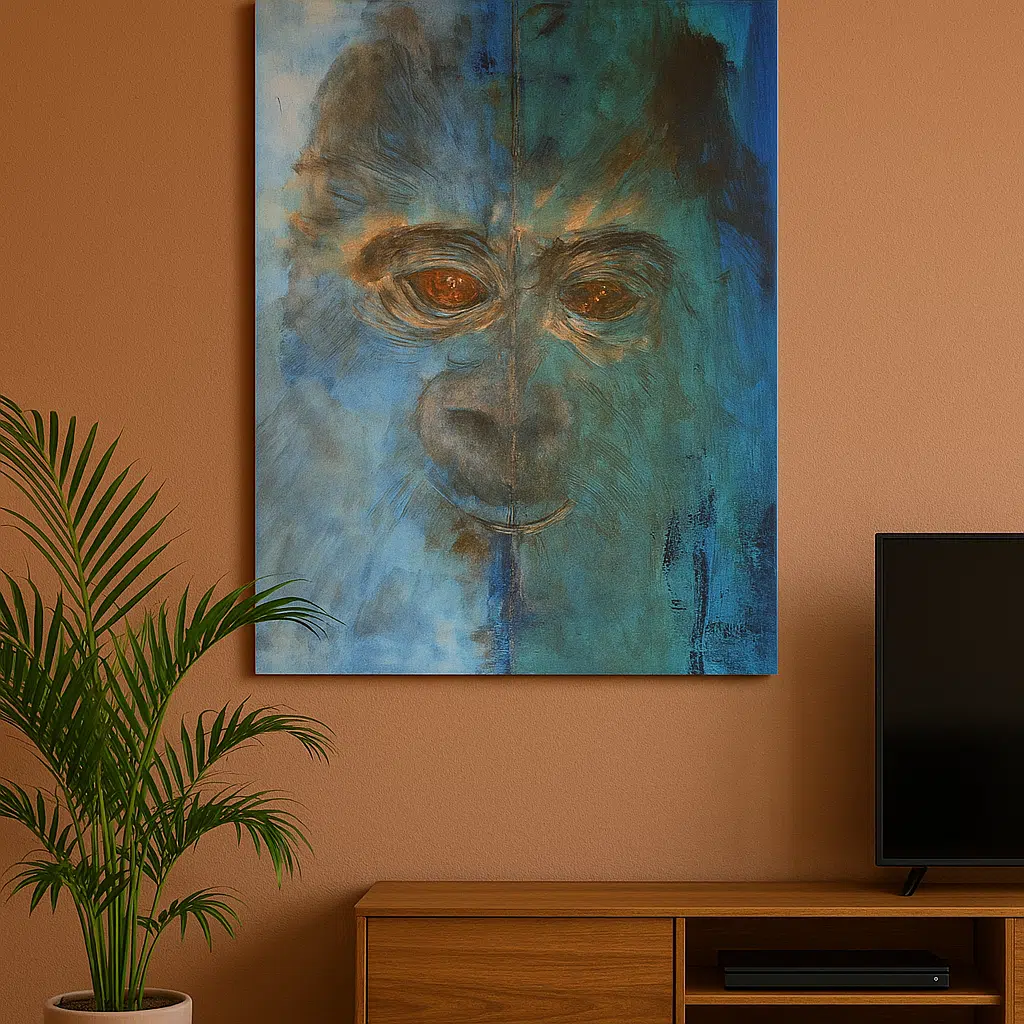 Een expressief schilderij van een babygorilla met organische vormen en diepe blauw‑ en aardetinten in verfijnde, schilderachtige textuur. Een sfeervol en intrigerend kunstwerk.