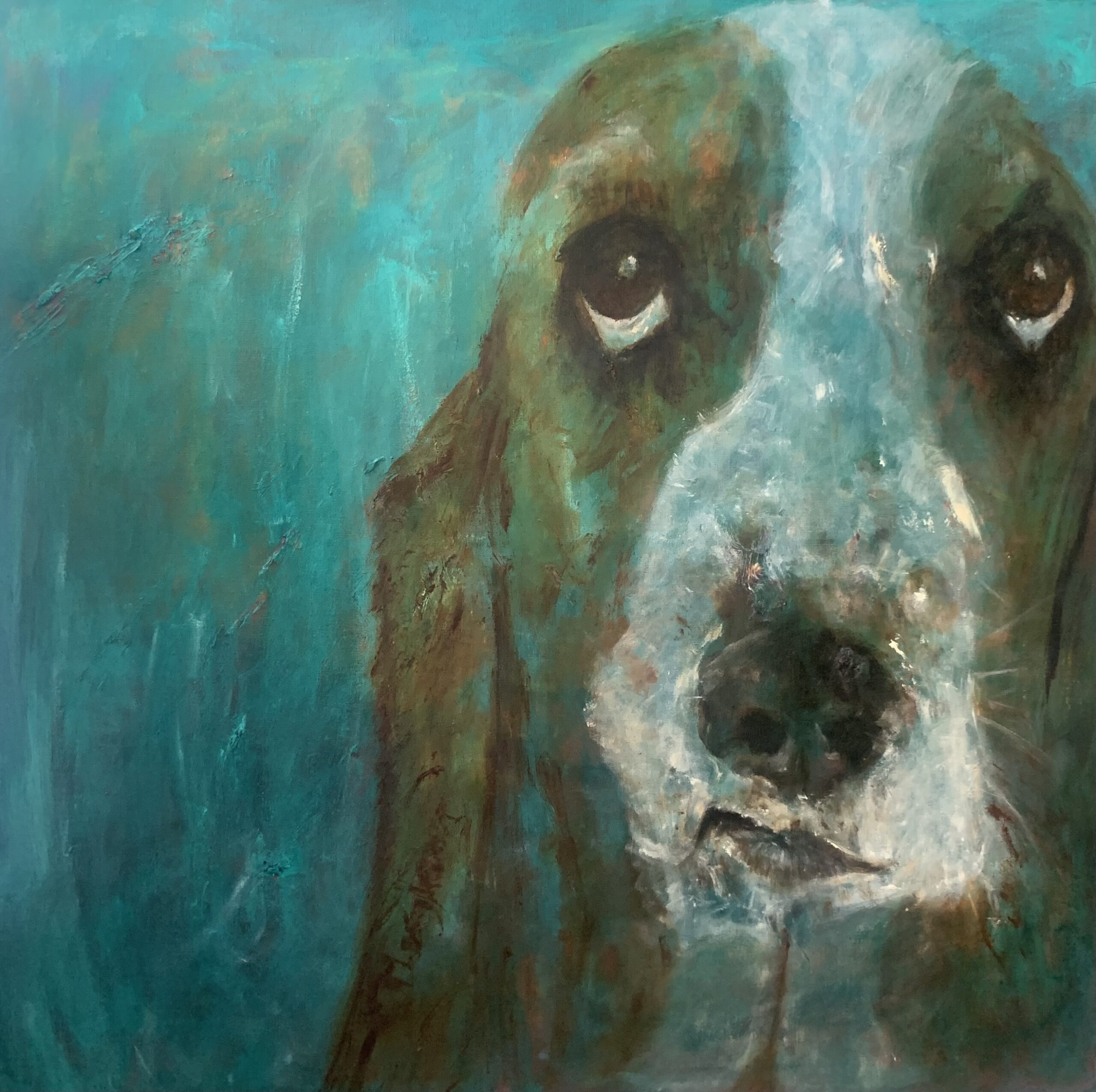 Dit schilderij toont een close‑up van de kop van een Basset, waarbij vooral de snuit, de ogen en een deel van de kop zichtbaar zijn. De achtergrond bestaat uit diepe turquoise en blauwgroene tinten, die in zachte, vloeiende overgangen langs het dier lopen. Deze kleurkeuze creëert een bijna waterige of dromerige sfeer, waardoor het dier lijkt op te duiken uit een kalme, verfijnde omgeving.