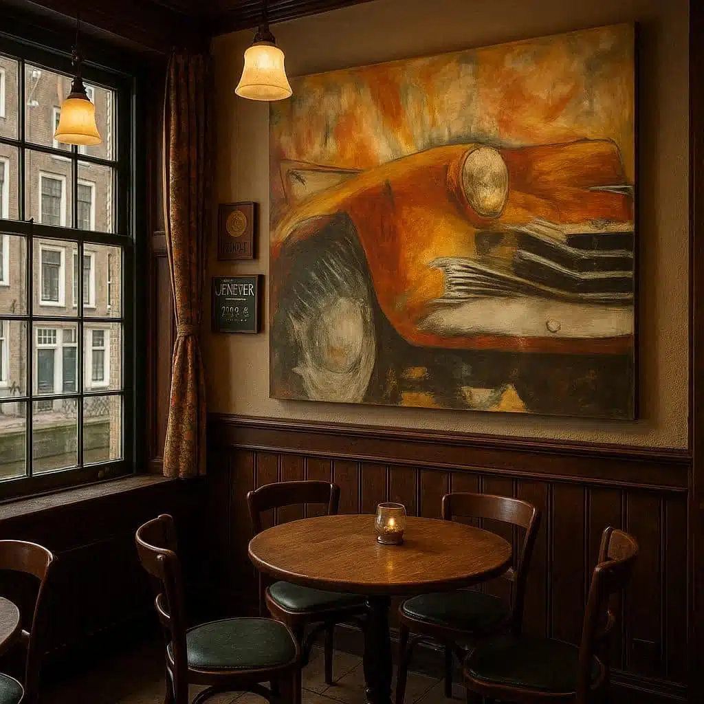 Het schilderij ademt nostalgie, snelheid en warmte, en is een ode aan de robuuste elegantie van klassieke automobielen.