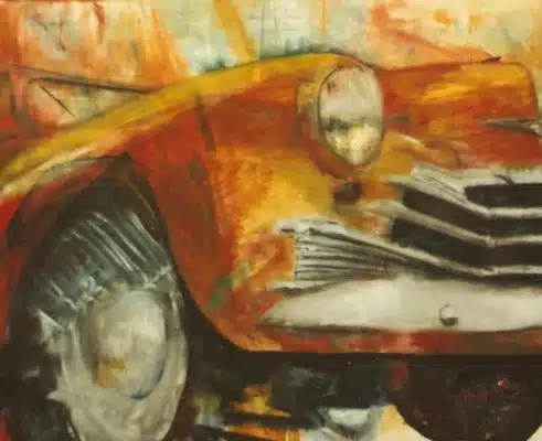 Dit schilderij toont een expressieve close‑up van de voorkant van een klassieke Chevrolet Fleetmaster, uitgevoerd in warme tinten van oker, rood en goudgeel. De kunstenaar gebruikt brede, losse penseelstreken die de carrosserie een energieke, bijna gloeiende uitstraling geven.