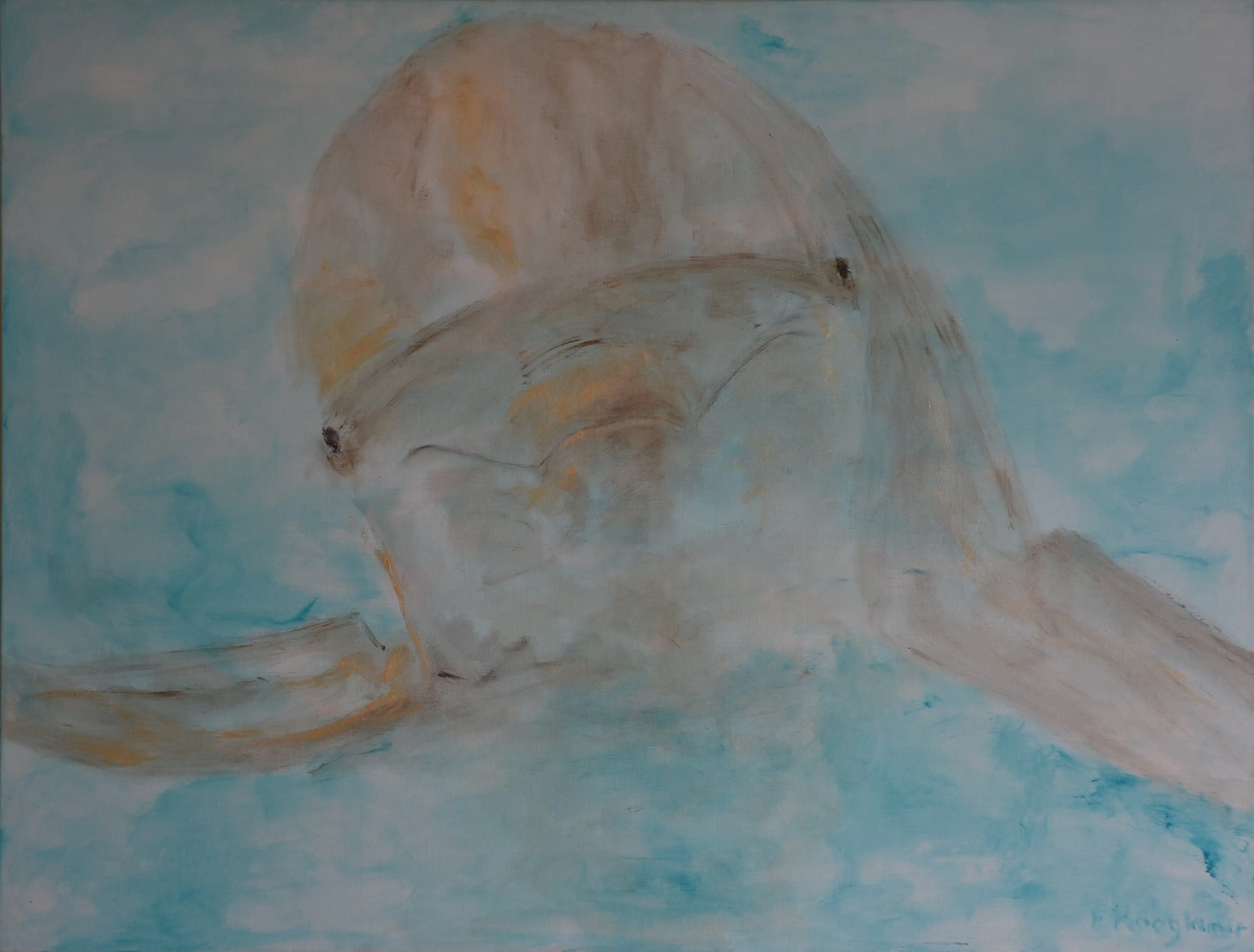 Dit schilderij toont een dolfijn die door helder water lijkt te glijden, weergegeven in zachte, bijna transparante penseelstreken. De kunstenaar gebruikt een palet van lichtblauw, turquoise en warme beige accenten om de vorm van het dier te suggereren zonder deze volledig te omlijnen. Dit geeft het geheel een dromerig, serene uitstraling, alsof de dolfijn even opduikt uit een wazige herinnering of een vluchtige glimp onder het wateroppervlak.