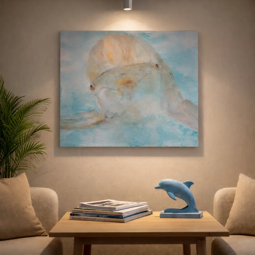 Het schilderij ademt zachtheid, vriendelijkheid en vrijheid — precies zoals veel mensen de dolfijn ervaren. Een poëtisch beeld van de onderwaterwereld.