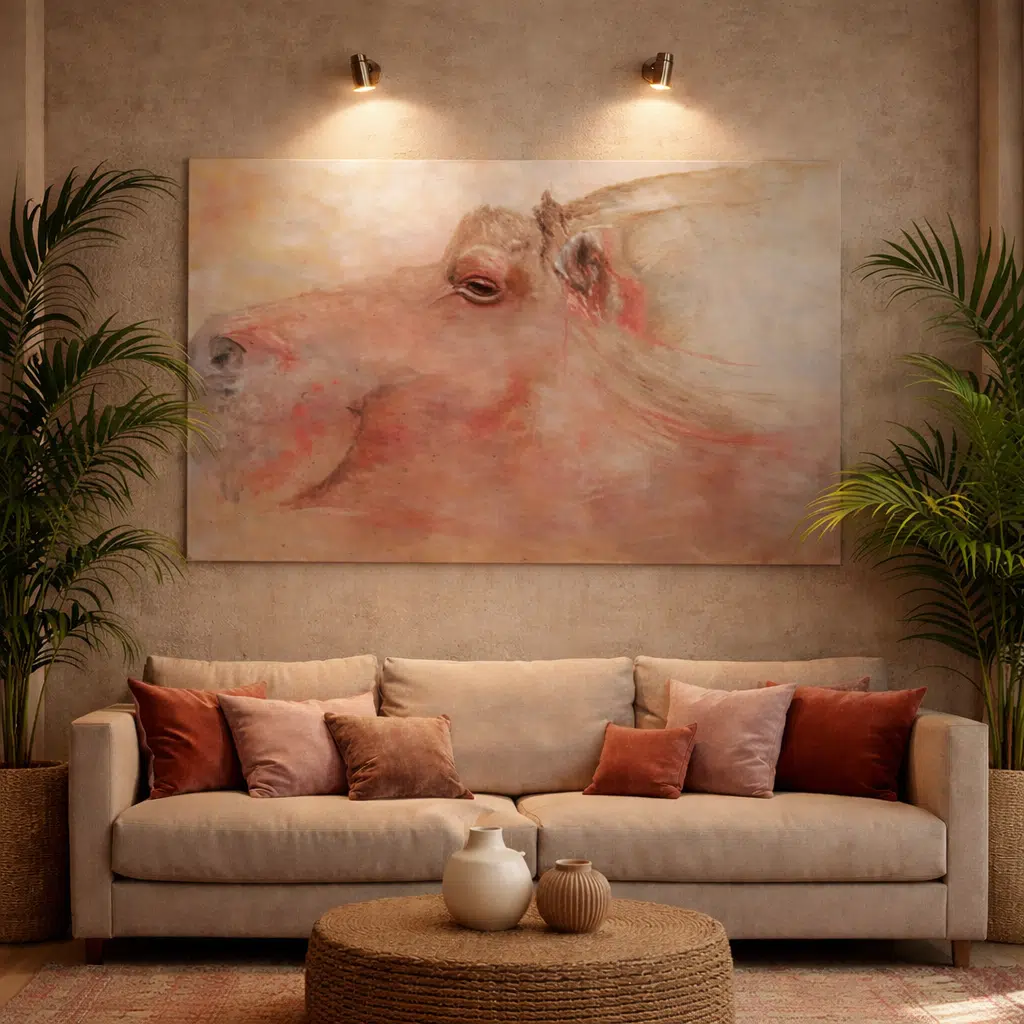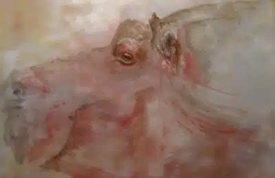 Dit schilderij toont het hoofd van een nijlpaard in zachte, bijna dromerige tinten. De kunstenaar werkt met een losse, vloeiende toets, waardoor het dier niet zwaar of massief oogt, maar juist verrassend licht en vredig.