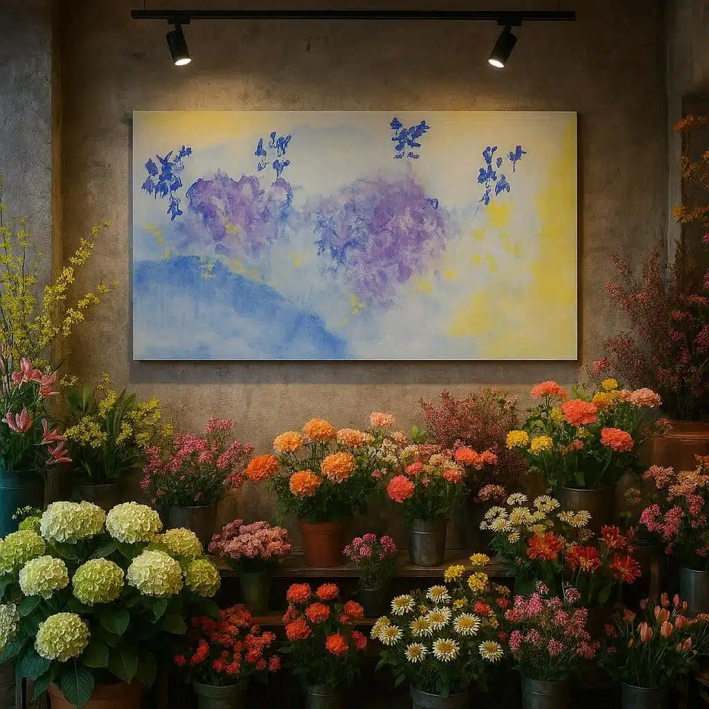 De achtergrond bestaat uit zachte overgangen van lichtgeel, crème en pastelblauw. Deze kleuren worden niet als harde vlakken gebruikt, maar juist als diffuus licht dat de bloemen lijkt te omringen. De paarse en blauwe accenten van de bloemclusters worden subtiel doorbroken door enkele donkerder takstructuren, die ritme en richting geven aan het geheel.