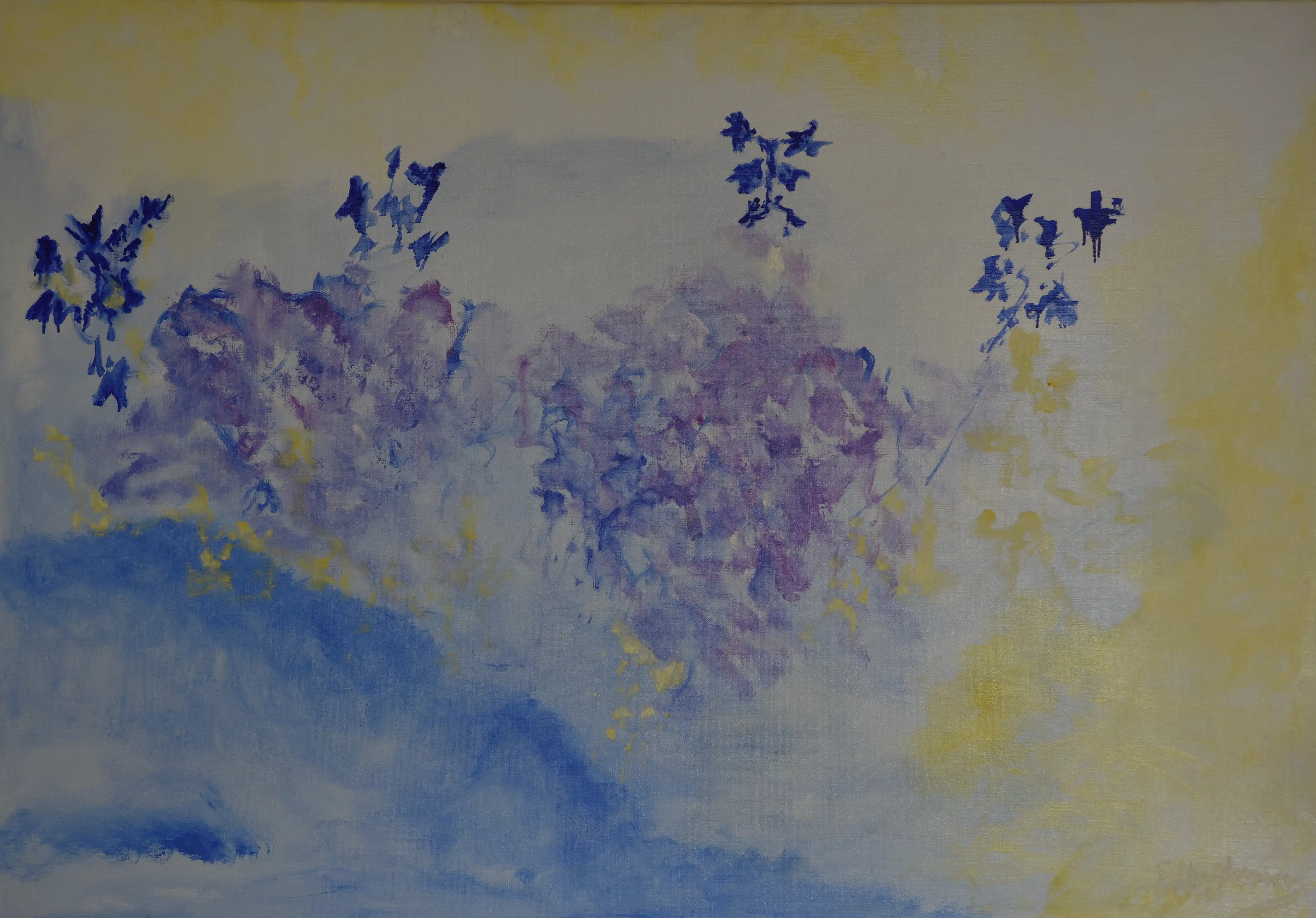 Dit schilderij toont een lichte, poëtische florale compositie waarin paarse, blauwe en gele tinten zacht in elkaar overvloeien. In het midden ontstaan clusters van bloemen — geschilderd met losse, impressionistische toetsen — die doen denken aan hortensia’s. De bloemen zijn niet strak omlijnd; in plaats daarvan lijkt hun vorm te ontstaan uit vlekken, schaduwen en kleurwolken, wat de compositie een zwevend, luchtig karakter geeft.