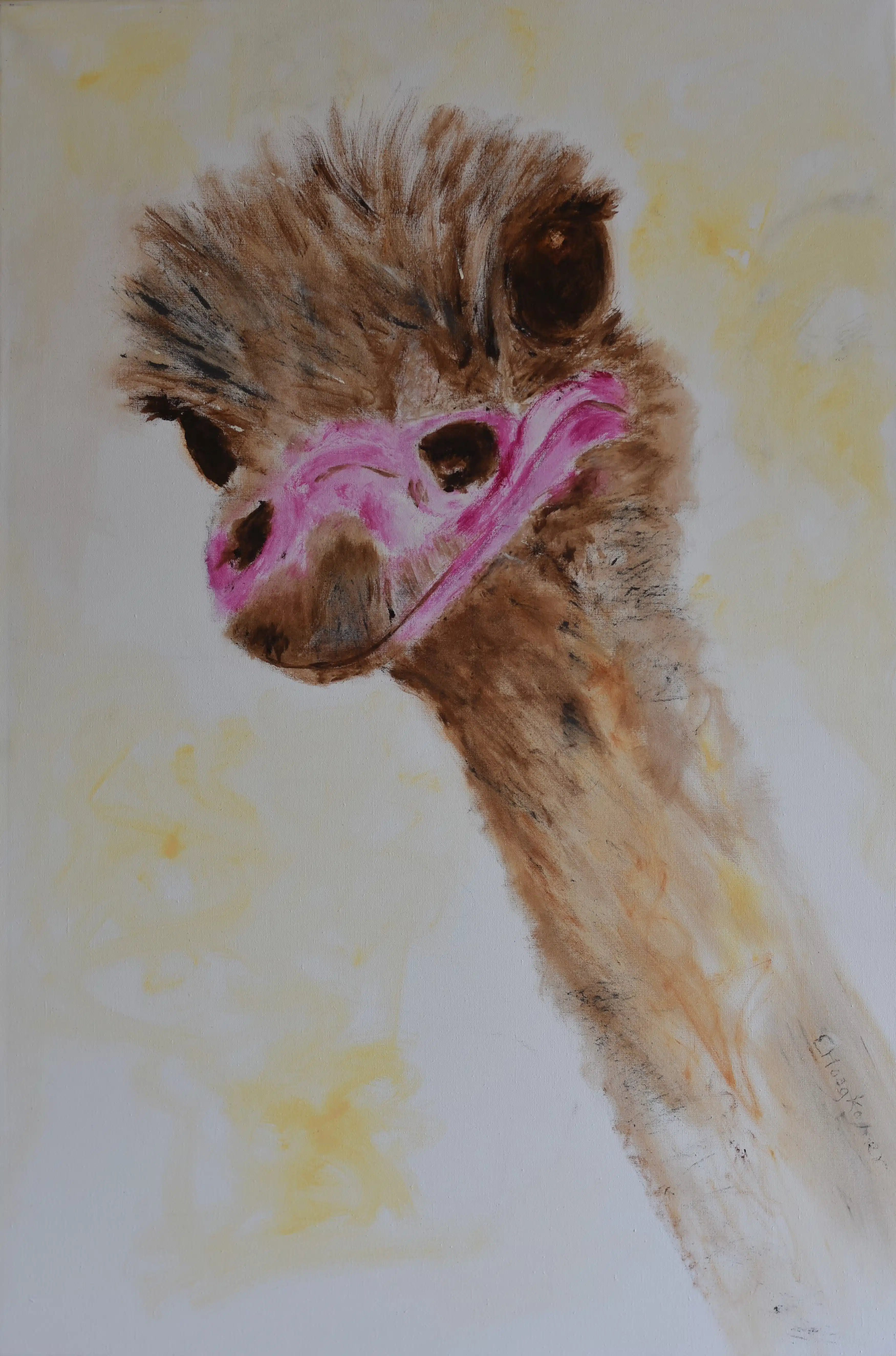 Dit schilderij toont een expressieve close‑up van een struisvogel, waarbij vooral de kop en lange hals centraal staan. De kunstenaar speelt zichtbaar met kleur en emotie: de snavel en gezichtsdelen zijn opvallend roze aangezet, wat het dier een speelse, bijna ondeugende uitstraling geeft. De zachte, veegachtige penseelstreken in bruin- en beigetinten suggereren beweging en textuur in de veren, terwijl de lichte achtergrond het geheel luchtig en warm houdt.