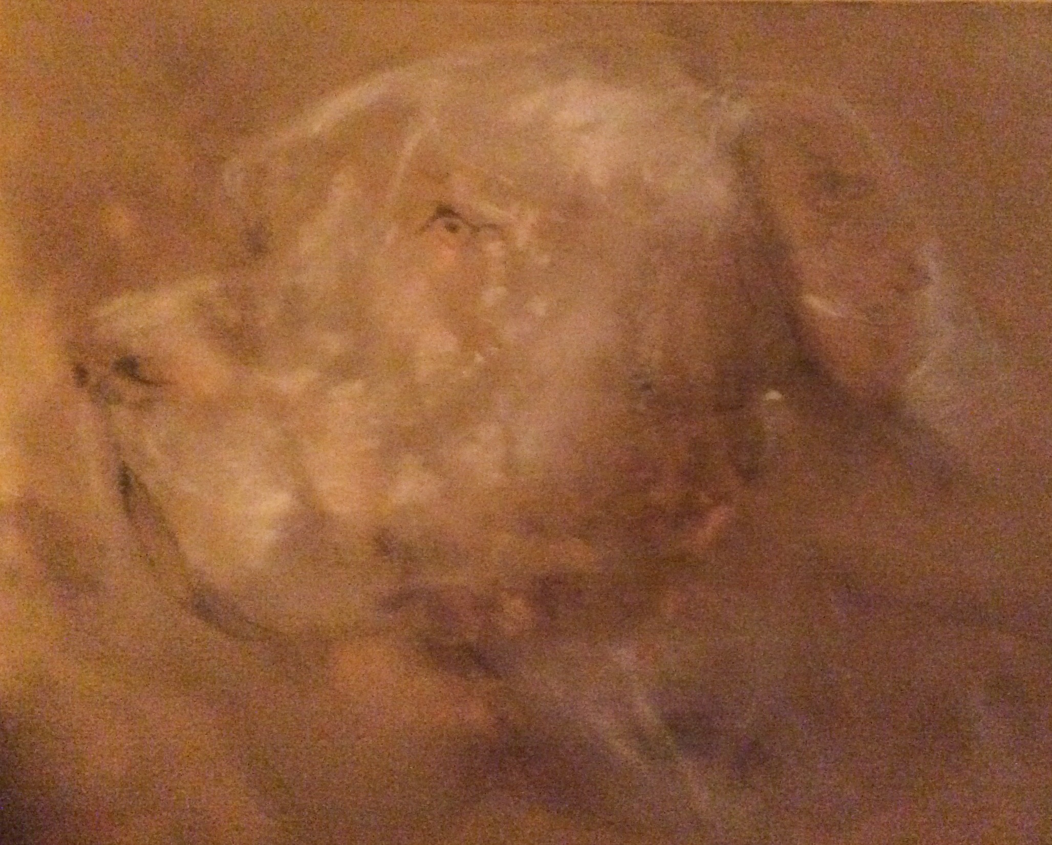 Dit schilderij toont de kop van een Deense Dog in zijaanzicht, weergegeven in een palet van zachte, warmbruine en beige tinten. De penseelstreken zijn vloeiend en nevelachtig, waardoor de vorm van de hond op een subtiele, bijna dromerige manier naar voren komt. Het geheel oogt alsof de hond langzaam uit een wolk van licht en kleur verschijnt; contouren vervagen en vloeien in elkaar over.