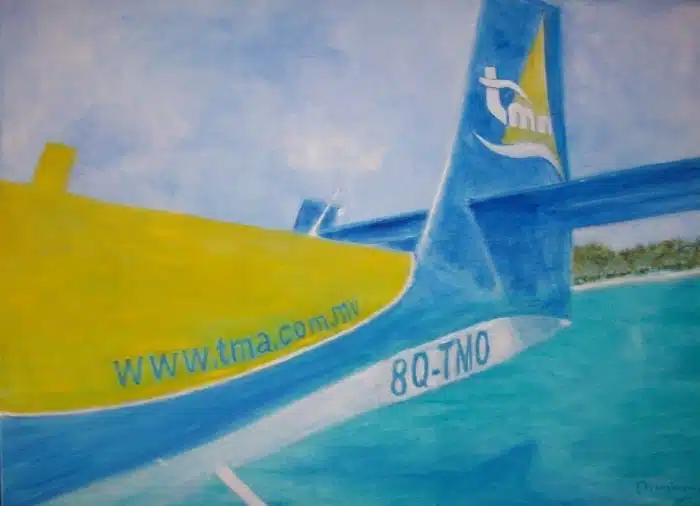 Dit schilderij toont een dynamische close‑up van een watervliegtuig dat dobbert op helder turquoise water onder een stralend blauwe hemel. De kunstenaar gebruikt krachtige kleuren: fel geel en diep blauw domineren het toestel en creëren een uitgesproken zomerse sfeer.
